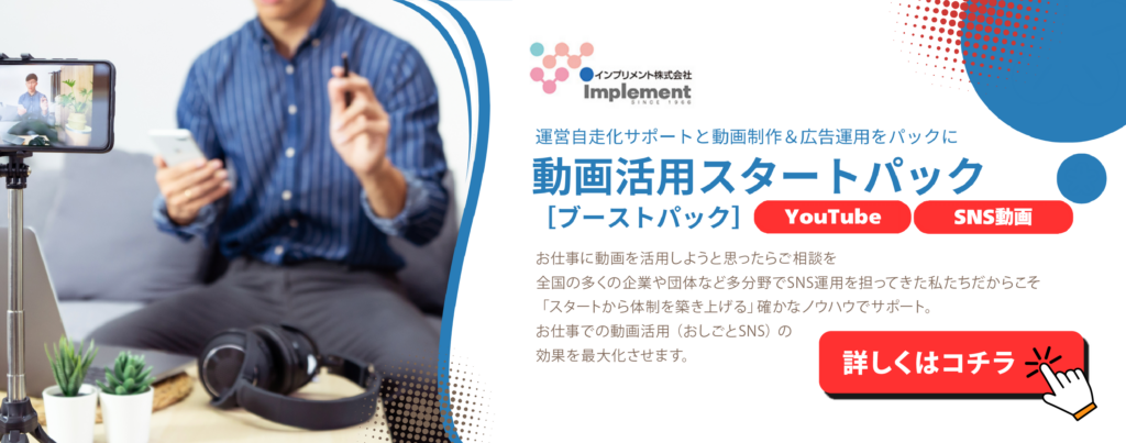 インプリメントでは長年にわたり企業での動画マーケティングに携わってきた実績をビジネスでの動画活用方法として体系化。企業としてビジネスとして、動画マーケティングを行なっていくための体制構築から運営方法までを一貫して提供しています。